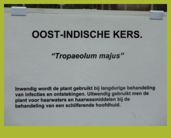 Echt àlles is te gebruiken van deze prachtige bloem: het blad & de bloemen in de sla of zomaar om te snoepen (vooral bij keelpijn). De onrijpe zaden kun je inmaken als kappertjes en de rijpe zaden gaan in de pepermolen! Van het hele bloeiende kruid maken wij een tinctuur.